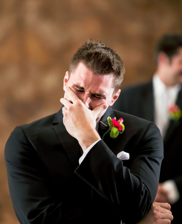A vőlegény azonnal könnyekre fakadt — kezével eltakarva az arcát, képtelen volt feldolgozni az áradó érzelmeket.