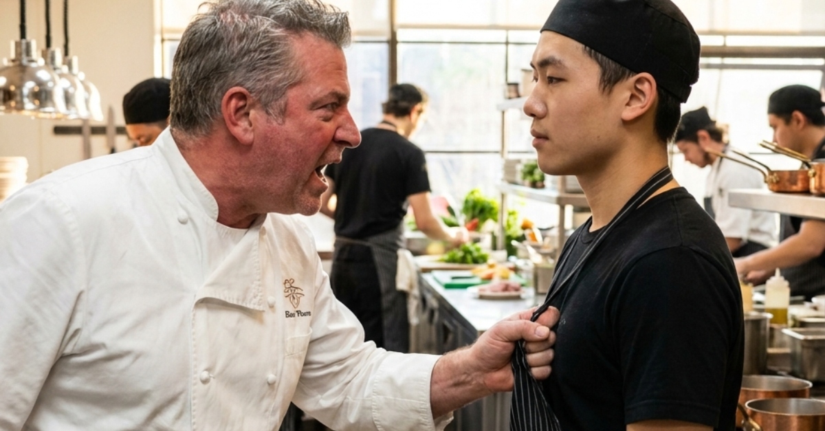 A konyha a gőz és az acél magas nyomású motorjaként működött, de a hangulat egy pillanat alatt megromlott, amikor a főszakács elvesztette a türelmét. Fehér vászon és düh kavargó villanásában előrerontott, ujjai rácsaptak a fiatal tanonc kabátujjára. Egy erőszakos rántással elrángatta a tálalóállomástól, a lendület pedig egy tál finom díszítést szórt szét a csempén. „Mindent tönkreteszel!” – üvöltötte a szakács, arca bíborvörös dühtől izzott, miközben egy sor ezüstkanalat söpört le a pultról; a csörömpölés lövések visszhangjaként pattogott az ipari falak között.