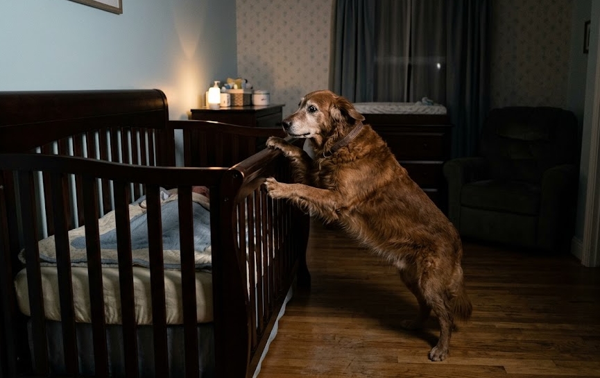 A gyerekszoba a lágy pasztellszínek és a súlyos árnyékok helyszíne volt, ahol az egyetlen hallható zajnak egy alvó csecsemő ritmikus légzésének kellett volna lennie. Ehelyett egy vékony, nádszálvékony sírás tört fel a mahagóni kiságyból, áthasítva az éjféli óra csendjét. Barnaby, a család idősödő golden retrievere reagált elsőként. Körmei ritmikusan kopogtak a keményfa padlón, ahogy szűk körben járkált az ágy körül, szűkölése pedig a baba nyugtalanságát visszhangozta. Érezte a folyosó végén lévő szülői hálószobából áradó csend súlyát, és tudta, hogy a szülők nem hallották meg. Kétségbeesésében hátsó lábaira ágaskodott, nagy mancsaival a kiságy faléceinek feszült, és megpróbálta megbökni a matracot – így próbálva kutyamódra álomba ringatni a gyermeket.