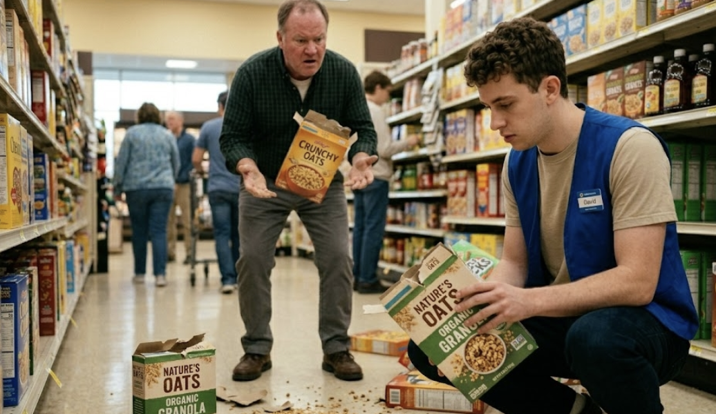 Nyugodt megfontoltsággal, amely éles ellentétben állt a férfi agressziójával, a dolgozó letérdelt. Nem sietett. Felvette az egyik leesett terméket – egy masszív kartondobozt bio granolával – és megforgatta a kezében. Nem nézett azonnal a dühös vásárlóra; inkább a tetején húzódó szakadásra figyelt, ahol a férfi durva mozdulata felszakította a kartont. Végül felnézett, arckifejezése kiismerhetetlen volt, hangja pedig meglepően nyugodt.